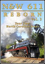 Norfolk & Western 611 - Reborn Volume 5Norfolk & Western J-class 4-8-4 #611 returned to the Norfolk Southern mainline in 2017 for 4 weekends of public excursions in the spring. In this video - the fifth and final volume in the "Reborn" series - we'll look at 2 of those weekends as #611 ran over some familiar territory in Virginia and North Carolina. As usual the locomotive spent the winter at the North Carolina Transportation Museum, and our coverage begins on Friday April 21st with a short ferry move from Spencer to Greensboro, NC for the 2nd weekend of excursions. The next day #611 pulled the first of two trips from Greensboro to Roanoke, a repeat of the previous year's popular "Roanoker" excursions which were covered in Reborn Vol. 3. You'll see both trips (April 22nd & 23rd), as #611 pulled a 20-car train under cloudy skies and, at times, heavy rain. These 260-mile trips ran from Greensboro north to Hurt, VA on the former Southern mainline, before taking the Virginian Railway west to Roanoke. With slippery rails and numerous steep grades the "J" put on a spectacular show, thanks in part to the inclement weather. The second half of the program covers the last trips of the year: the annual Roanoke excursions. You'll see all three days of operation (May 27-29) during the Memorial Day weekend, as #611 pulled half-day trips over two of the most famous grades on the N&W: Blue Ridge and Christiansburg Mountain. 2017 featured an extra trip over the Christiansburg grade, as the Monday trip to Lynchburg was cancelled in favor of the more popular run to Walton. Despite the familiar routes, you'll see #611 working hard at many new locations. Filmed entirely in HD, this program features #611 racing down the mainline with a heavy train and no diesel assistance. You'll see the legendary J-class thundering through the mountains, just as the N&W intended when she rolled out of the Roanoke shops in 1950. This program has minimal narration (with the option to turn it on or off) and no distracting music. It's available on standard definition widescreen DVD, High Definition Blu-ray disc, and for rental or purchase through Vimeo's On Demand streaming service. | |